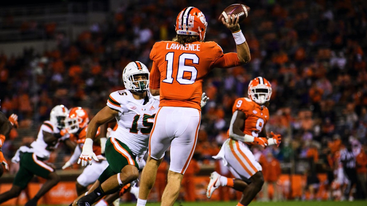 Lawrence threw with pace, with precision and with touch, passing for 292 yards and three touchdowns while running his streak of pass attempts without an interception to 355. Among his career-high 41 attempts were several throws that some current NFL starting quarterbacks cannot make. He also manipulated the Hurricanes defense with play fakes and deftly read their coverages. He also once again showed his inherent toughness, bouncing back from a painful shot to the midsection that left him laid out on the field, then coming back and finishing the drive with a touchdown run. (And an uncharacteristic spike of the ball that drew a personal foul flag.)