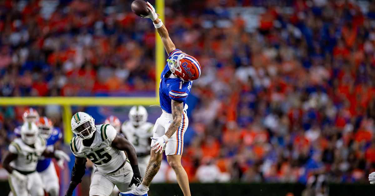 Gators wide receiver Ricky Pearsall did his best to make fans pay attention to the action in the Swamp, as he hauled in what was quite possibly the catch of the year in the first quarter from quarterback Graham Mertz.