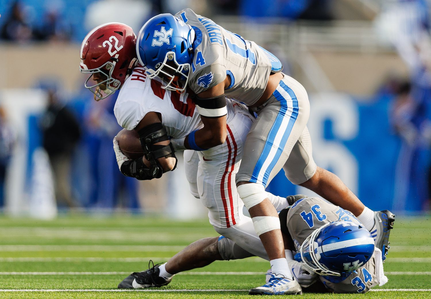 Kentucky's defense gang-tackling Alabama RB Jase McClellan (11th Nov., 2023)