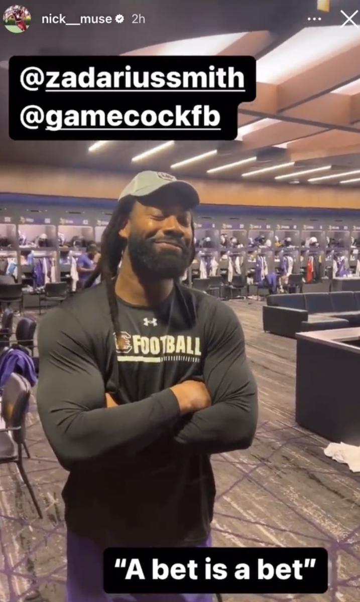 The Gamecocks won on Saturday, meaning Muse won on Monday. He posted a video to his Instagram story in which Smith was donning South Carolina gear as a punishment.