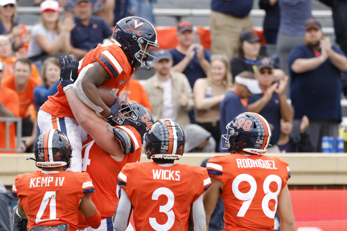 4. Jelani Woods hauls in a touchdown pass from Brennan Armstrong just before halftime to put the Hoos up 34-0.