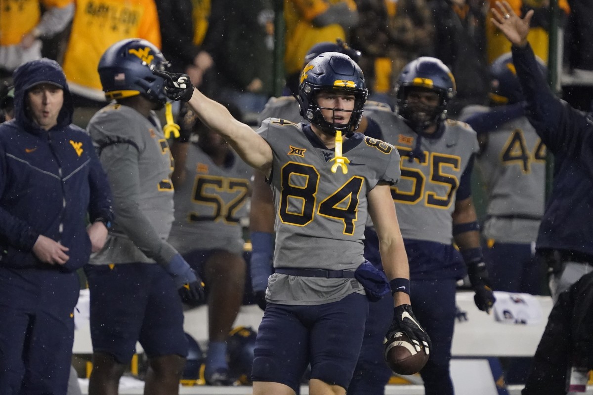 Nov 25, 2023; Waco, Texas, USA; West Virginia Mountaineers wide receiver Hudson Clement (84) reacts after a first down catch against the Baylor Bears during the first half at McLane Stadium.