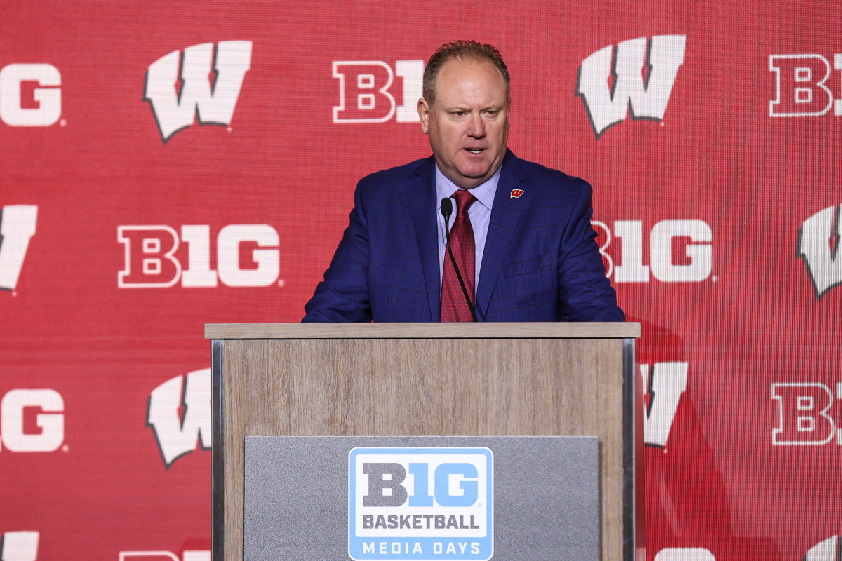 Oct 10, 2023; Minneapolis, MN, USA; Wisconsin Badgers head coach Greg Gard speaks to the media during the Big Ten basketball media days at Target Center. Mandatory Credit: Matt Krohn-USA TODAY Sports
