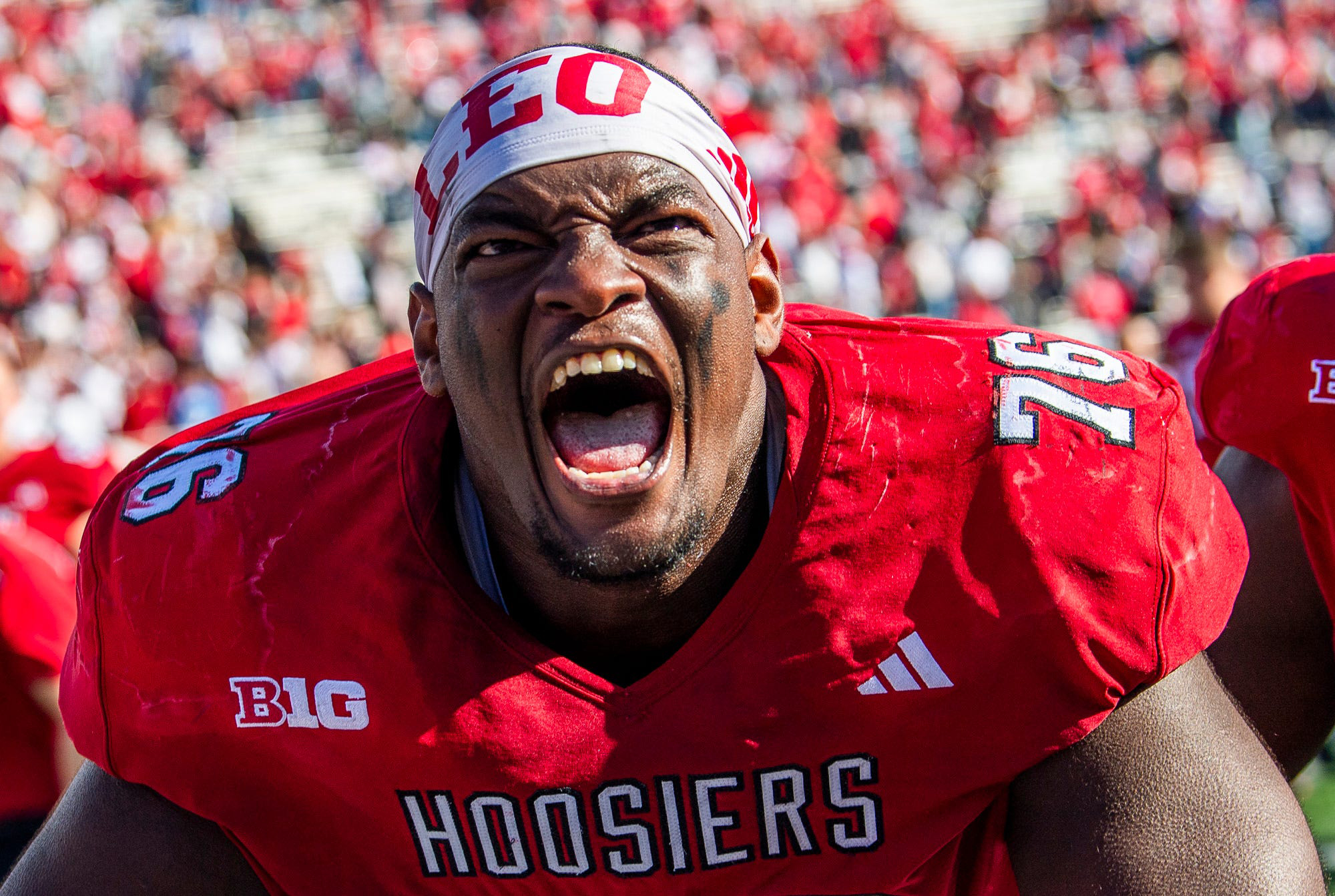 Nov 4, 2023; Bloomington, Indiana, USA; Indiana's Matthew Bedford (76) celebrates after defeating the Wisconsin Badgers at Memorial Stadium. Mandatory Credit: Rich Janzaruk-USA TODAY Sports