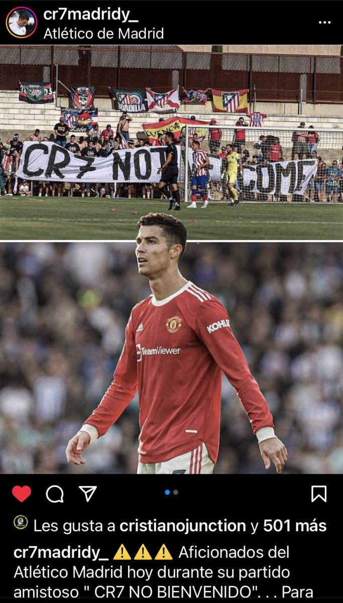 Con emojis de risas, Cristiano Ronaldo respondió una publicación en Instagram que daba la nota de la manta colocada en el entrenamiento del Atlético de Madrid con la frase “CR7 not welcome” en una clara muestra del ambiente hostil que enfrentaría el delantero.
