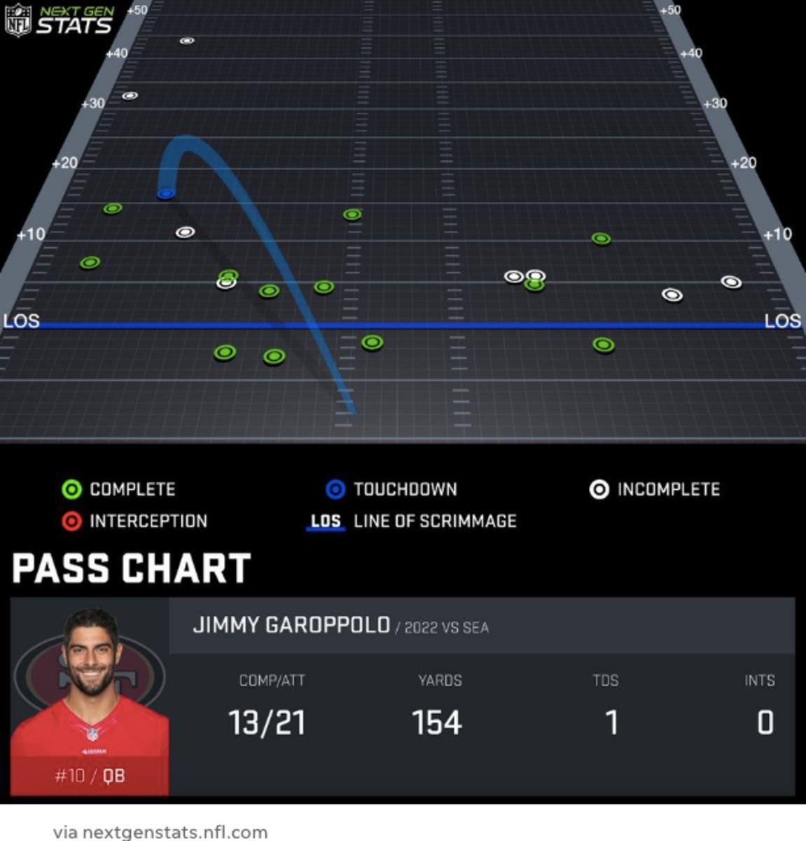 Solo tres de los pases de Garoppolo cubrieron más de 15 yardas. Esto no fue un problema porque los Seahawks son malos, pero seguramente significará que Shanahan tenga que arrancar varias páginas de su libreta de jugadas.