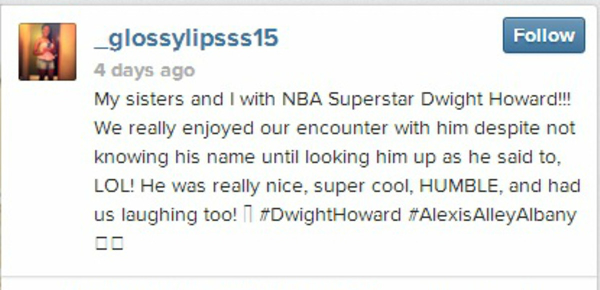 It should be noted, though, that it appears from this young lady's Instagram post of her meeting with Not Dwight Howard, that he introduced himself as the 3-time Defensive Player of the Year, and encouraged her to look him up. That is not cool, Guy Who Does Not Look Very Much Like Dwight Howard.