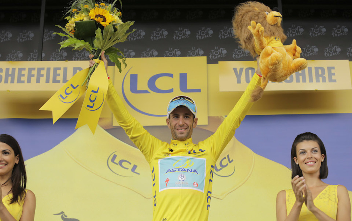 Cyclists typically receive three things after winning a stage in the Tour de France: the yellow jersey, flowers, and a kiss on the cheek from the podium girls. Well, unless you're VincenzoNibali. After winning Stage 2 in Sheffield on Sunday, he could only secure the first two on that list -- though he certainly tried his best to get the third: