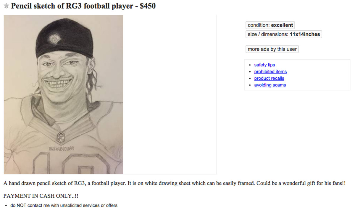 NFL fans looking for new wall art might enjoy the listing of a Robert Griffin III pencil sketch currently on Craigslist for $450.
