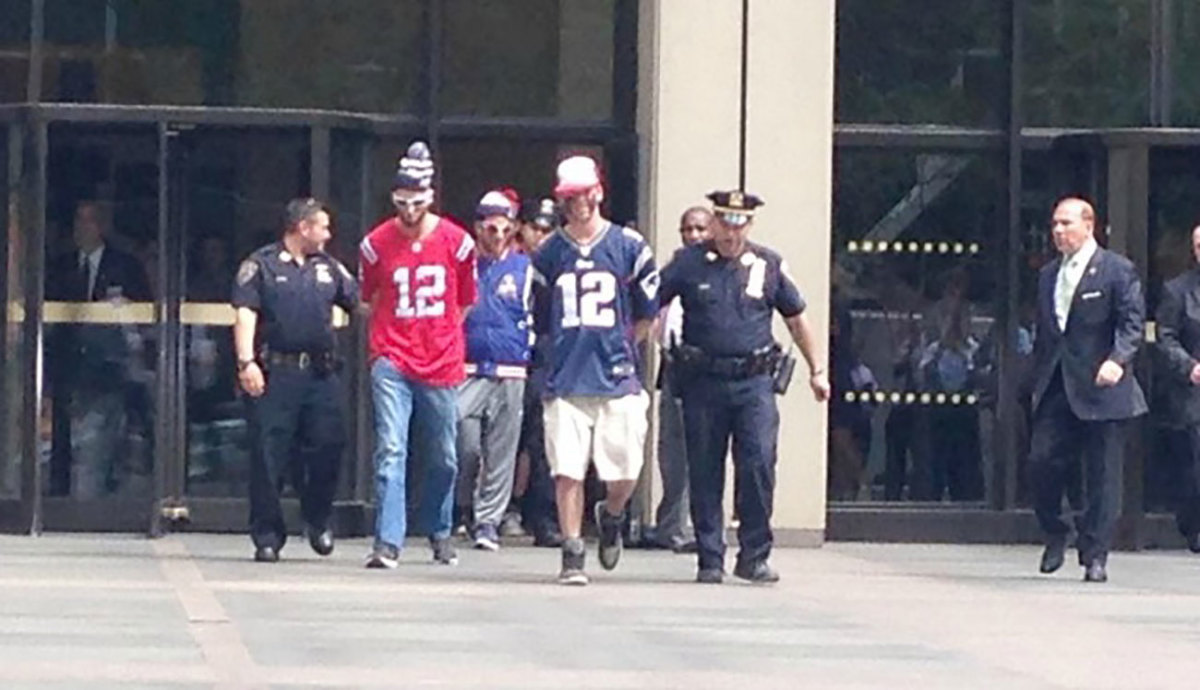The group carried signs that read “Free Brady” and “Fire Goodell” as they attempted to confront commissioner Roger Goodell for handing down a four game suspension to quarterback Tom Brady.