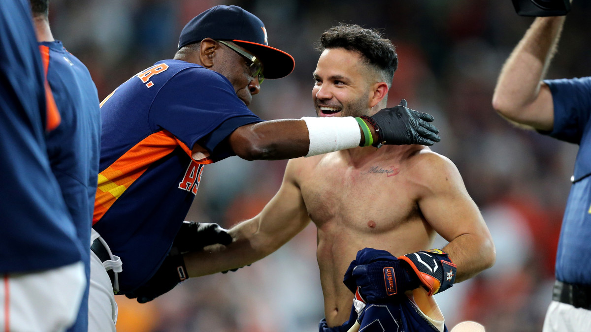 As Altuve approached home plate, Maldonado started motioning for Altuve to ditch the jersey. Then, Maldonado and a few other Astros tore the jersey off of him.