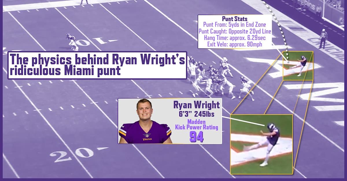 Knowing the energy delivered to the ball, Gay can figure out how fast the football is exiting Wright’s foot. A normal punt is around 75 miles per hour. One that travels as far as Wright’s did puts it in the range of a kickoff, which goes 90 miles per hour. So give or take a few mph, the football was traveling at nearly the speed of an Major League Baseball fastball.