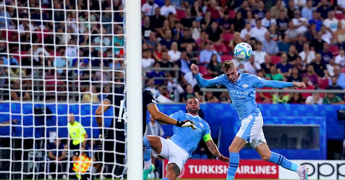 Cole Palmer pictured (right) heading the ball to score for Manchester City in the 2023 UEFA Super Cup final