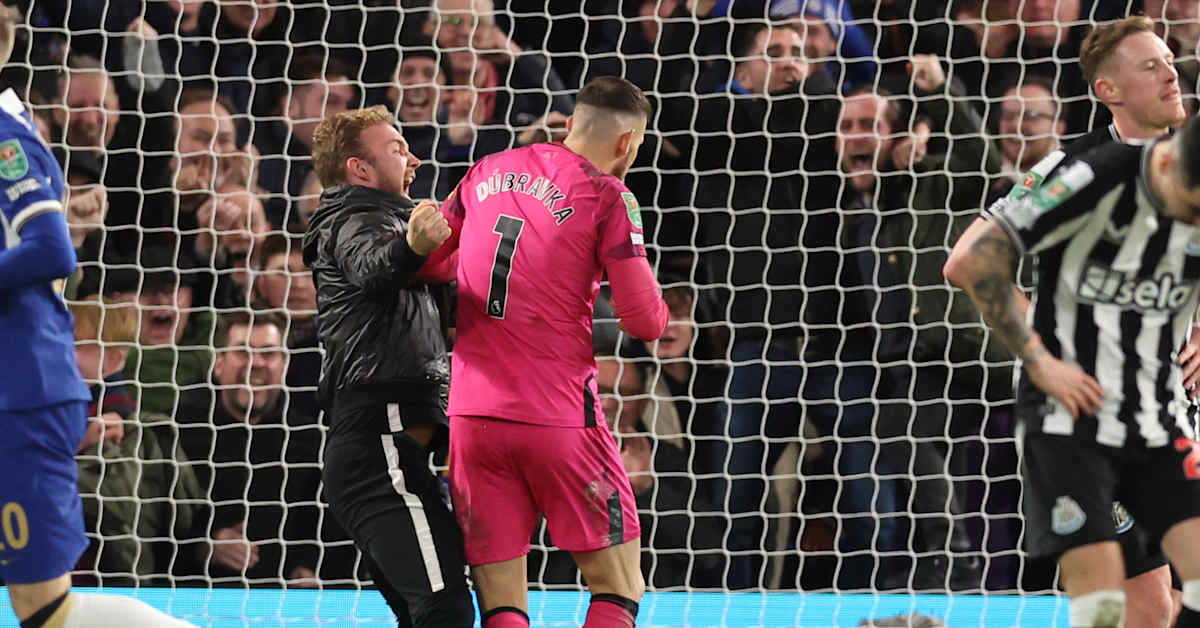Chelsea Pitch Invader Aggressively Celebrates In Face Of Newcastle Keeper Martin Dubravka After Late Mykhailo Mudryk Goal In EFL Cup