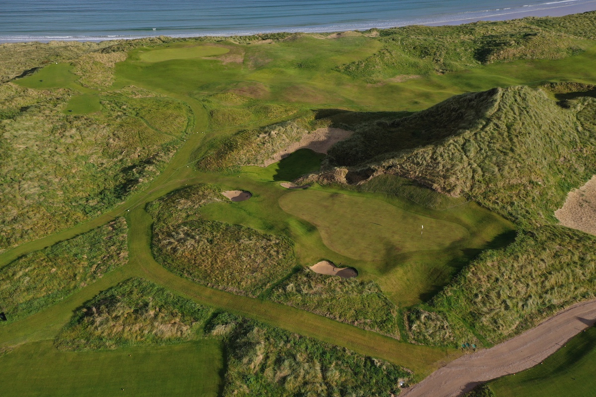 An aerial view of Narin & Portnoo Links' 11th green with the 10th in the background.