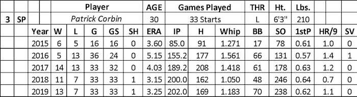 Corbin allowed 22 of 24 home runs to right-handed batters while owning a more significant edge vs. lefties (.190) and at home (8-2 with a 2.40 ERA and 125 Ks over 105 innings). His AFB (92.5) had more life than in 2018 (91.3). He relies heavily on his elite slider (.160 BAA while accounting for 182 of his strikeouts), which Corbin threw 37.7 percent of the time. His show-me curveball (.200 BAA) had success. He tried a few more changeups (.367 BAA) while his sinker (.275 BAA) graded as a slight negative.