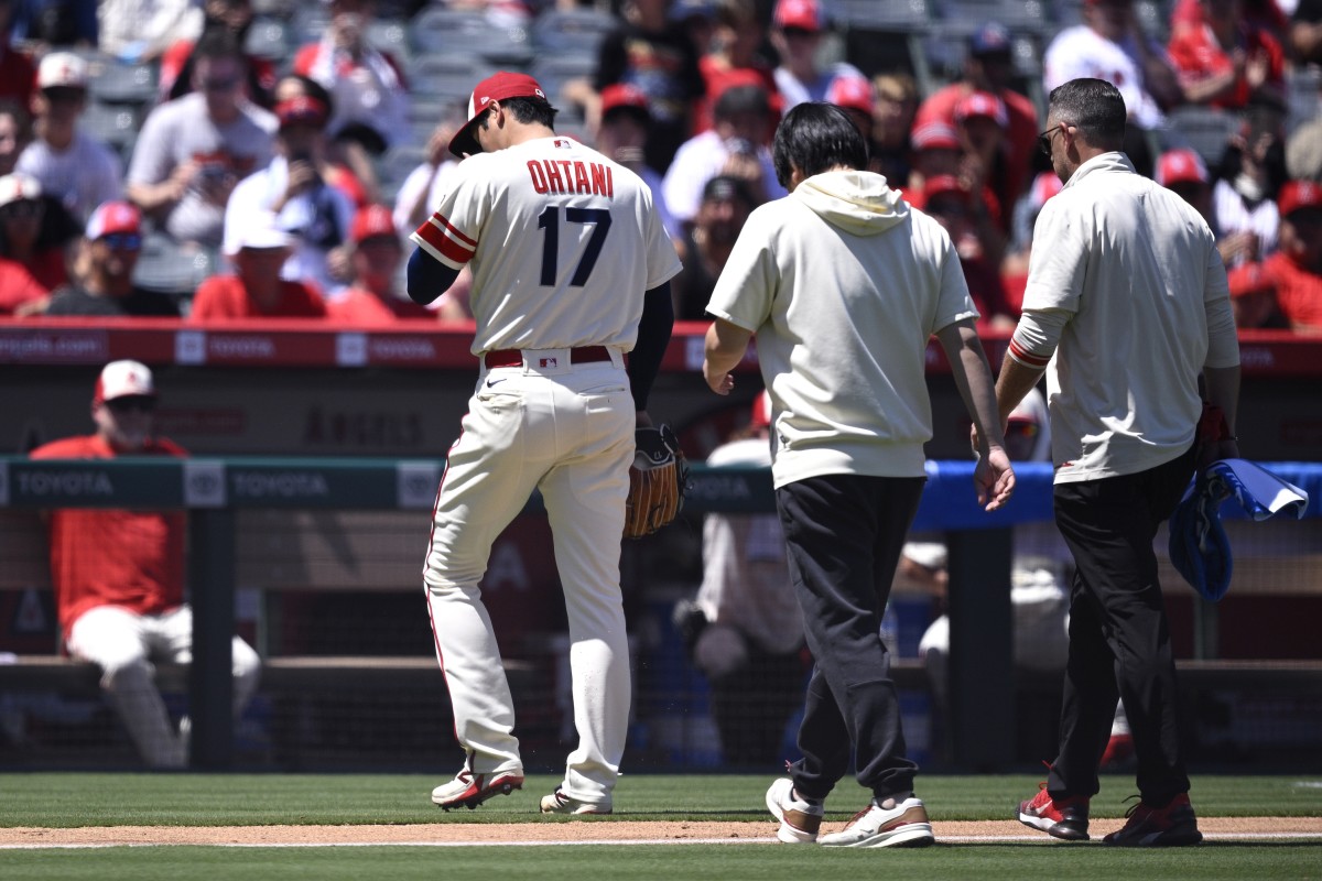 Ohtani is still eligible to hit in the game, but he was taken out as a pitcher and left the field with trainers.