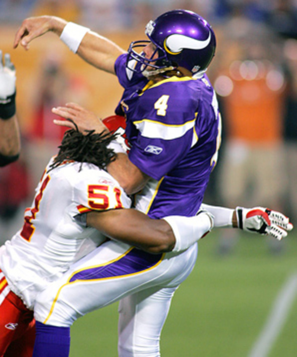 4. The Vikings weren't the only ones with all eyes on the quarterback. Kansas City's own new acquisition, Matt Cassel, already was facing pressure to perform after a mediocre outing (2-of-5 for 15 yards) in the 16-10 loss to Houston in the Chiefs' preseason opener. This time, he was much better, playing the entire first half and connecting for 99 yards on 9-of-14 passing with one touchdown (four-yard pass to Dwayne Bowe). He was at great bodily risk, however, getting sacked three times by the Minnesota pass rush, and exited not a minute too soon.