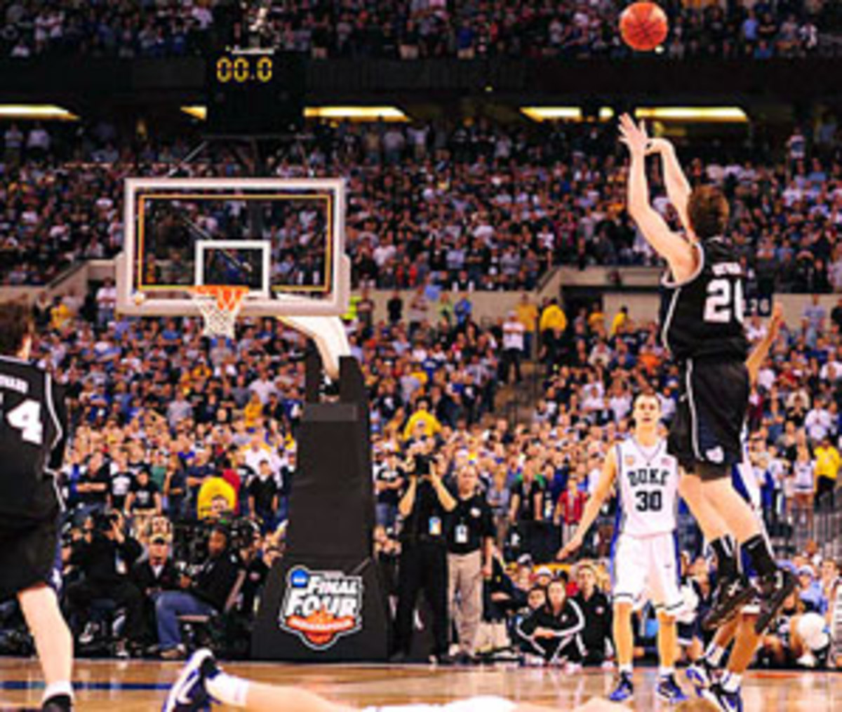 And that's how it came down to that last, desperate heave. Duke's Brian Zoubek stood at the free-throw line with Duke up one. There were 3.2 seconds left. Zoubek made the first free throw. And then, using a herky-jerky motion, he purposely missed the second. Krzyzewski had decided that his team's best shot was to get the clocking going (Butler had no timeouts) and force Butler into some sort of desperate and hopeless heave toward the basket.