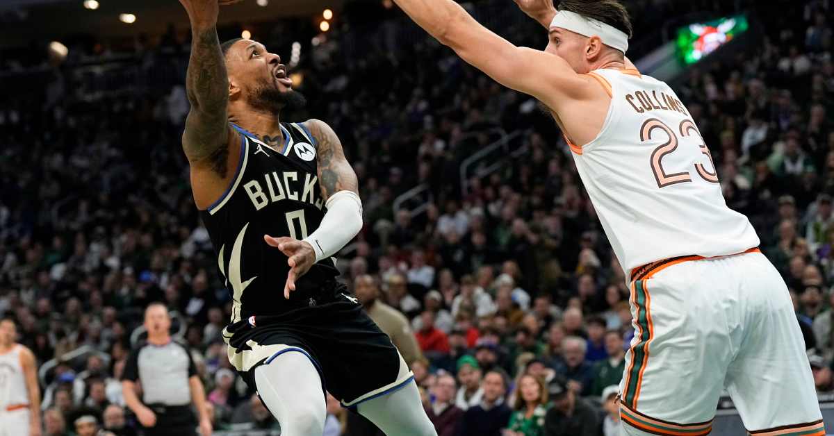 Dec 19, 2023; Milwaukee, Wisconsin, USA; Milwaukee Bucks guard Damian Lillard (0) shoots around San Antonio Spurs center Zach Collins (23) during the first quarter at Fiserv Forum.