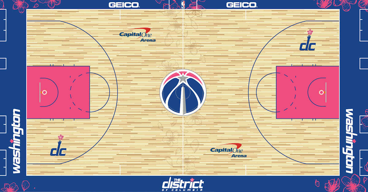 The new cherry blossom court will be used on nights the team’s City Edition jerseys will be worn and will debut tonight when the Wizards host the Dallas Mavericks at Capital One Arena at 7:00 pm.
