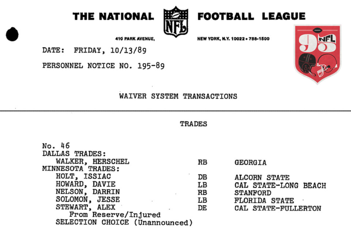 Unlike most of the blockbuster deals that predated it, the Herschel Walker trade had scope and championship consequences. A few years before free agency became the main mode of player transitions, thus eliminating mass trades, Jimmy Johnson took over for Tom Landry in Dallas and rattled off over 50 in five years, beginning with the deal that sent star running back Herschel Walker to the Minnesota Vikings. Eighteen picks and players were also involved, the vast majority heading to the Cowboys. So convinced that he was pulling the right strings, Johnson negotiated a $1 million parting bonus for Walker, who had promised teammates he wasn’t agreeing to any trade to Minnesota as rumors swirled around the 0-5 Cowboys in mid-October 1989.
