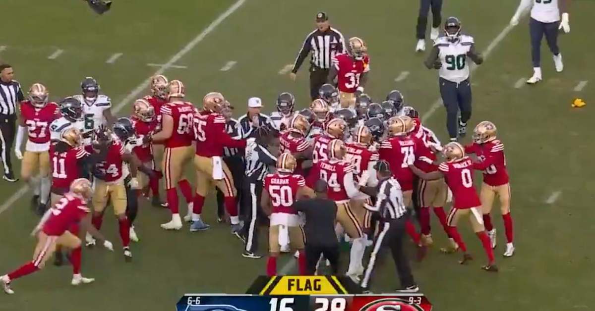 Linebacker Fred Warner had the ball in his hands, but was wrapped up by Seattle wide receiver DK Metcalf. After Warner flipped the ball to a teammate, Metcalf gave him a pretty healthy body slam. That slam led to some shoves back and forth, and ultimately, a fracas.