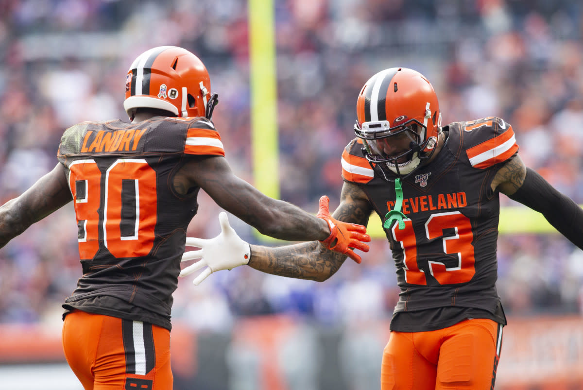 Browns wide receiver Jarvis Landry (80) celebrates with wide receiver Odell Beckham (13) after scoring a touchdown during a 2019 game against the Bills.