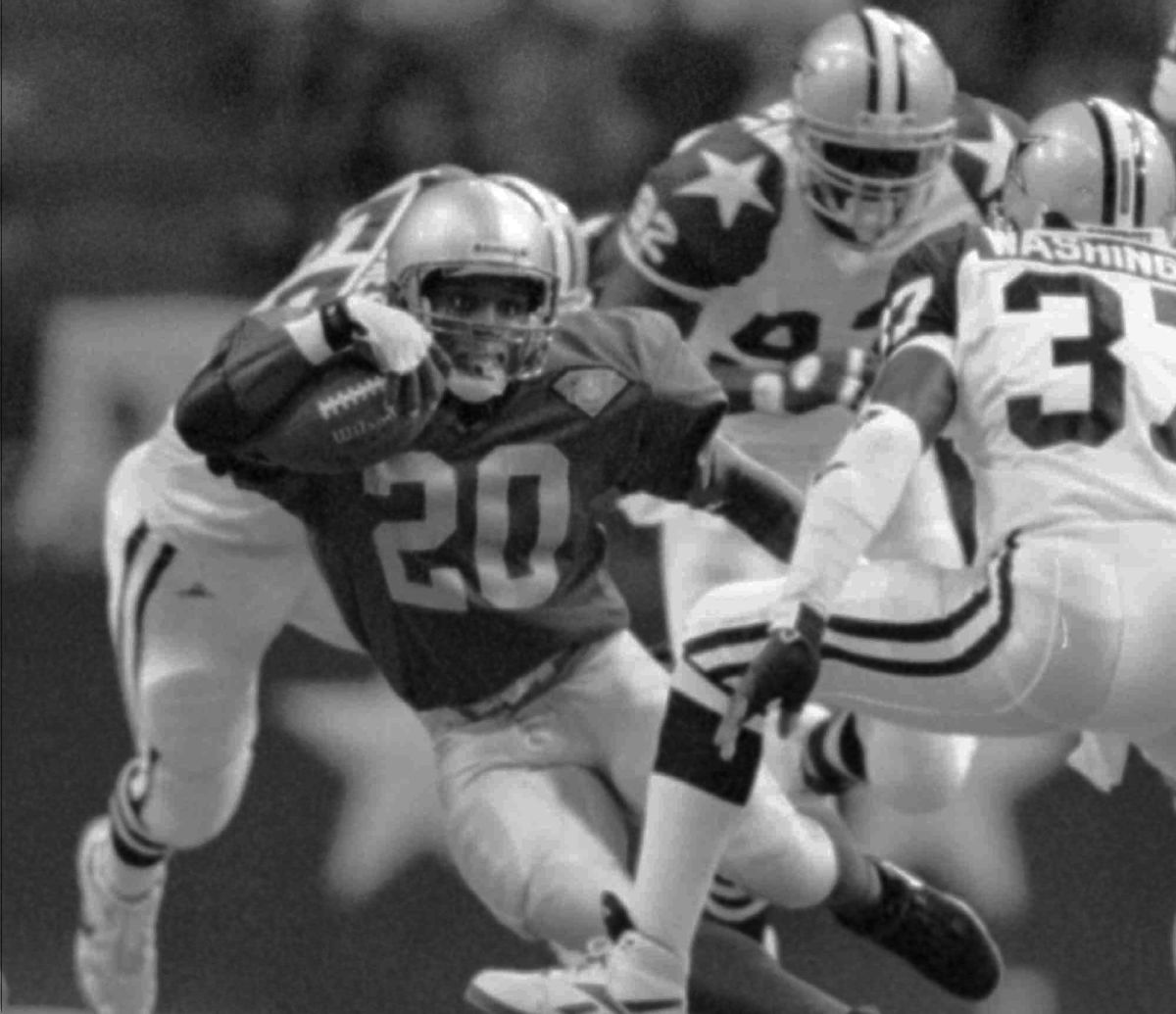 Lions running back Barry Sanders (20) looks for a way around Cowboys James Washington (37), Sept. 19, 1994, in Irving, Texas.