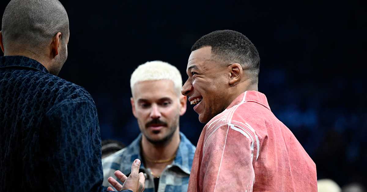 Kylian Mbappé (right) in attendance at the NBA Paris Game between the Brooklyn Nets and the Cleveland Cavaliers at AccorHotels Arena.